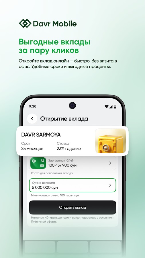С помощью приложения «Davr Mobile», вы можете получить кредит, физически не посещая филиал банка. Все, что вам требуется – в несколько кликов оформить кредит через современное и удобное приложение.