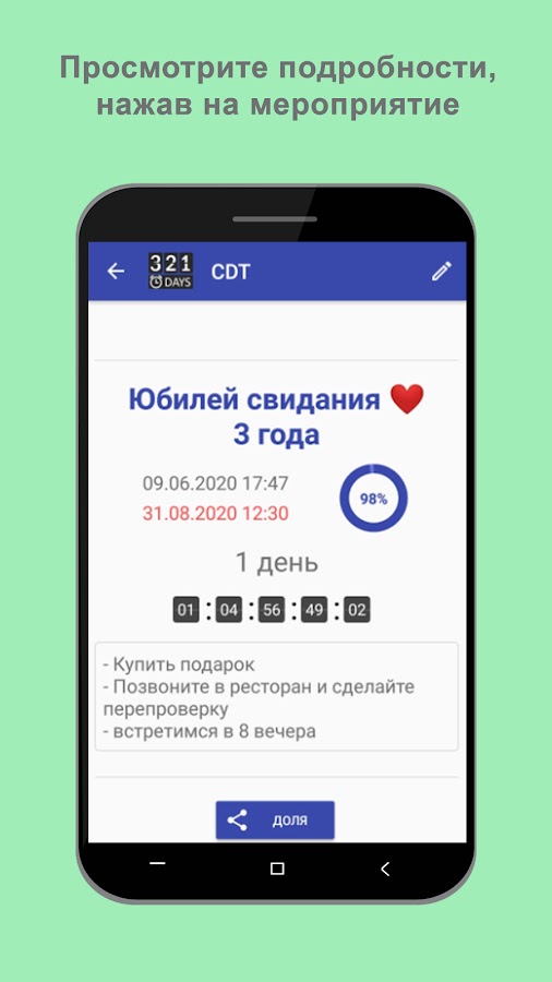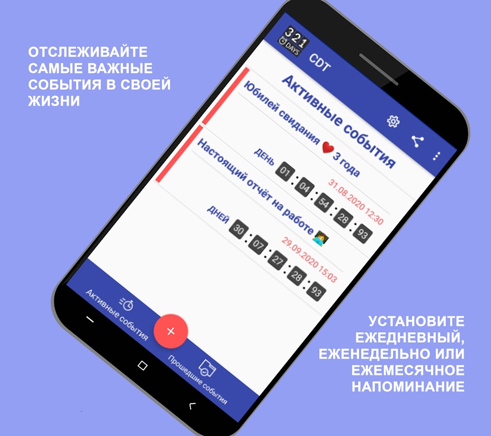 Скачайте приложение счетчик дней (обратный отсчет) для Android бесплатно - последняя версия (1.3.0) уже доступна для установки на ваш телефон или планшет.