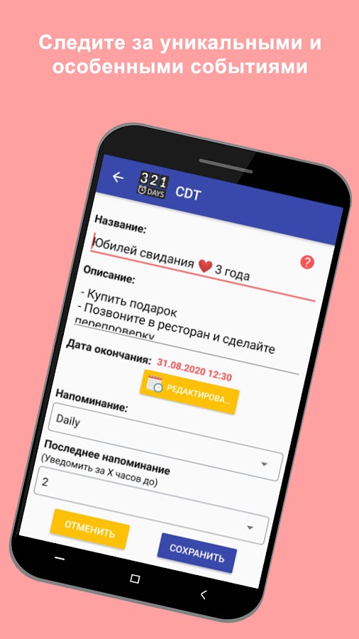 Используя CDT, вы никогда не забудете самые важные даты. Создайте счетчик для записи всех важных событий, и CDT отправит вам напоминание о приближении даты.