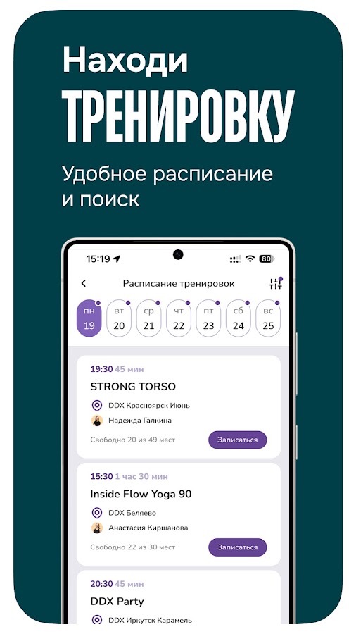 • Возможность записи на групповые тренировки различного уровня сложности и длительности, а также на программу Smart Start — авторские бесплатные занятия в тренажёрном зале DDX Fitness с тренером для новичков