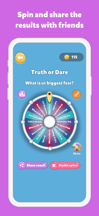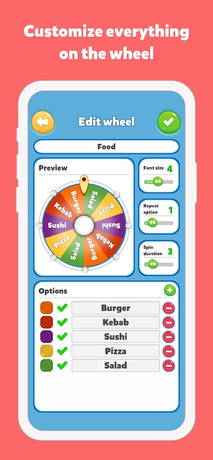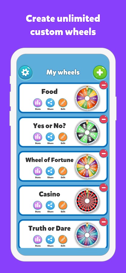 Наше приложение полностью настраивается с помощью таких функций, как настраиваемые цвета и шрифты колес, смайлики, регулируемая продолжительность поворота, статистика колес и несколько скинов на выбор. Кроме того, нет никаких ограничений на количество вариантов, которые вы можете добавить, что делает его идеальным для всего: от лотерейных розыгрышей до выбора занятий дома.