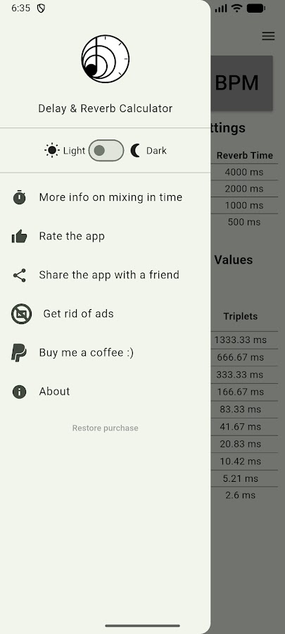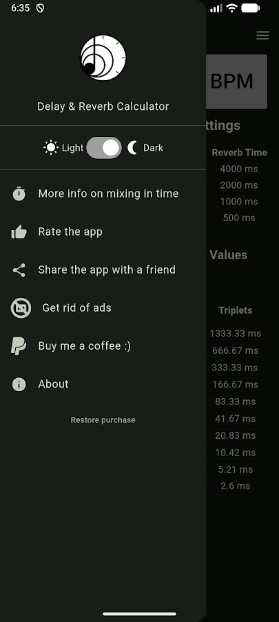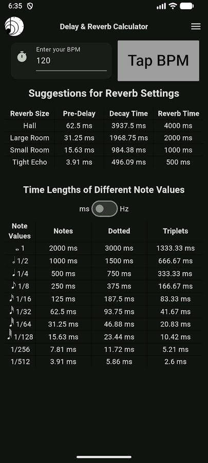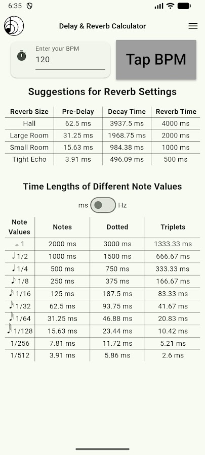 Создайте идеальное звуковое оформление для вашей музыки с помощью приложения «Калькулятор задержки и реверберации». Это приложение упрощает расчет времени задержки и реверберации для ваших треков, позволяя добиться профессионального звучания. Просто введите темп вашего трека, и приложение сгенерирует точное время задержки и реверберации для различных длительностей нот. Независимо от того, являетесь ли вы новичком или опытным продюсером, это приложение — идеальный инструмент для профессиональной настройки реверберации в соответствии с атмосферой ваших песен.