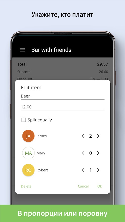☆ 3 режима разделения: разделить по позициям чека, разделить в пропорции или разделить поровну