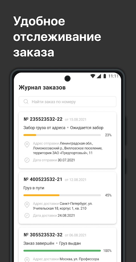 Вся информация в вашем смартфоне: журнал заказов отслеживание груза, ориентировочная дата прибытия уведомления об изменении статуса перевозки