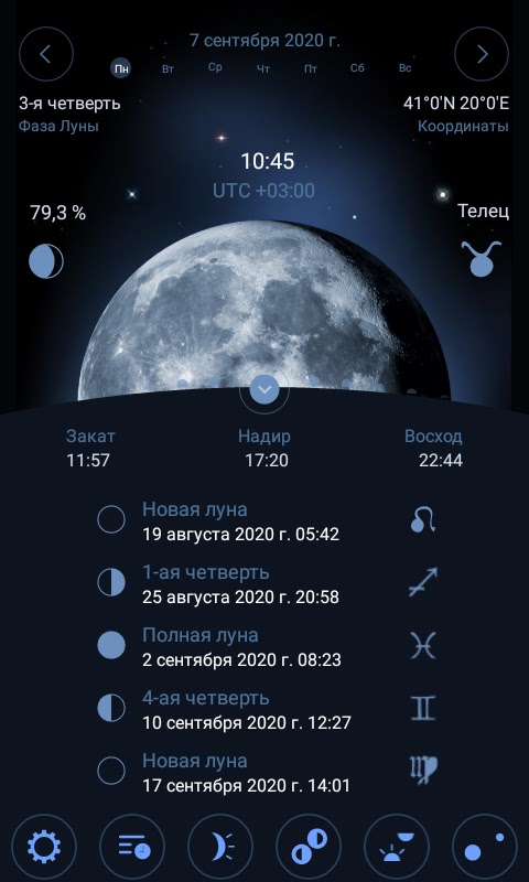 + Точное время фаз луны на главном экране (выдвигающаяся снизу панель)