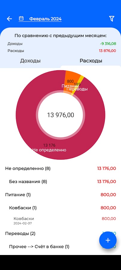 С помощью фильтра можно посмотреть, сравнить и проанализировать финансы за любой период, по любой категории, кошельку и даже заголовку. Графики подробно покажут, где и в каком месяце было падение или взлет затрат или доходов по определенной категории или заголовку операции в категории, а также сравнить с предыдущим периодом