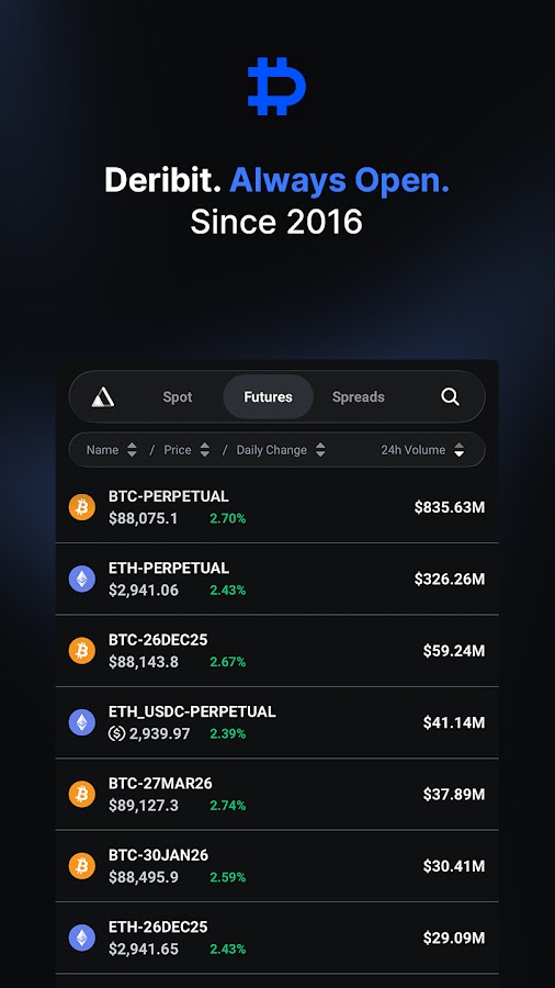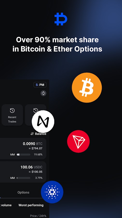 Представляем новое приложение Deribit — лучший инструмент для торговли фьючерсами, опционами и спотовой торговлей криптовалютами. Будучи лидером рынка опционов на Bitcoin и Ethereum с долей более 80%, Deribit стал предпочтительным местом для трейдеров, желающих уверенно и легко торговать этими криптовалютами.