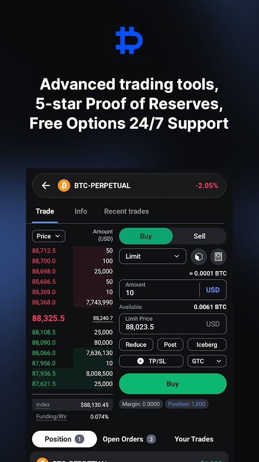 Приложение оснащено передовыми торговыми инструментами, такими как лимитные, рыночные, условные и скользящие ордера; Настройки GTC, GTD, IOC, FOK; реализация Deribit только для пост-трейдинга с автоматической корректировкой цены и тестовой сетью для мобильного приложения.
