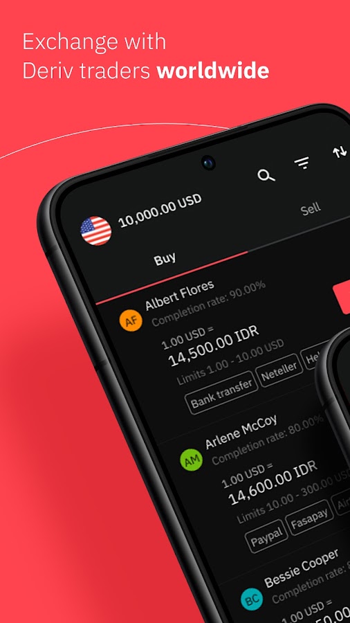 Deriv P2P — это платформа одноранговых переводов, которая облегчает обмен средствами между нашими клиентами. Пользователи могут вносить и снимать средства со своих счетов Deriv. Мы интегрировали 106 способов оплаты, включая Paypal, Alipay, Skrill, Wechat Pay, Webmoney, Google Pay, Apple Pay, P2P-кошельки, банковские переводы и т. д. Продавайте или покупайте доллары США в обмен на вашу местную или поддерживаемую валюту (доллары США, фунты стерлингов). , NGN, COP, COU, CDF, ZAR, LKR, PKR, INR и т. д.) Найдите объявление, соответствующее вашим требованиям, или разместите собственное объявление на нашей гибкой, надежной и интуитивно понятной платформе, предлагаемой для настольных и мобильных устройств.