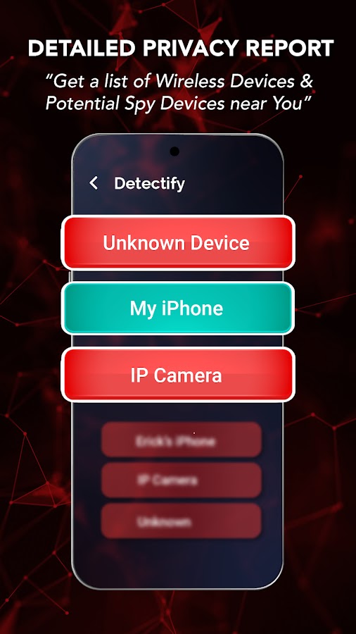 Detectify может помочь обнаружить потенциально скрытые камеры с помощью функции обнаружения шпионских камер, а также подслушивающие устройства и скрытые микрофоны. Он также работает как сканер для обнаружения подслушивающих устройств и помогает обнаружить скрытые устройства, излучающие магнитные поля или инфракрасное излучение.