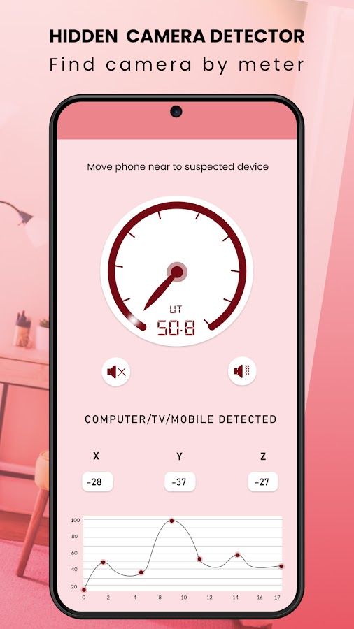 Hidden Camera Detector Finder — это удобный инструмент, который поможет вам обезопасить себя от записи шпионскими камерами. Теперь вы можете искать скрытые камеры и электронные устройства вокруг вас через свой телефон с помощью этого инструмента для поиска шпионских детекторов скрытых камер. Поскольку большинство электронных устройств излучают ЭМП, шпионские камеры и устройства можно легко обнаружить. В то время как некоторые скрытые жучки или крошечные шпионские устройства, такие как скрытые камеры, излучают инфракрасный свет, невидимый для человеческого глаза, инфракрасный свет скрытой камеры можно обнаружить с помощью камеры телефона. Это приложение для поиска детектора скрытой камеры определяет уровень полей излучения ЭМП в окружающей среде с помощью предустановленных датчиков телефона. Это приложение включает в себя больше функций, которые помогут вам в повседневной жизни.