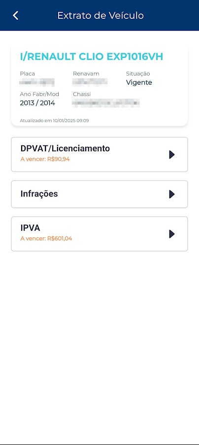 * Выдать выписку о долгах вашего автомобиля (IPVA, Licensing, DPVAT Insurance и нарушения)