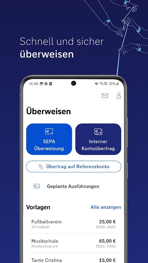 +++ Отправка денег +++ Перевод денег (в режиме реального времени) – вручную или путем сканирования счета/QR-кода. Настройка постоянных платежных поручений и запланированных переводов.
