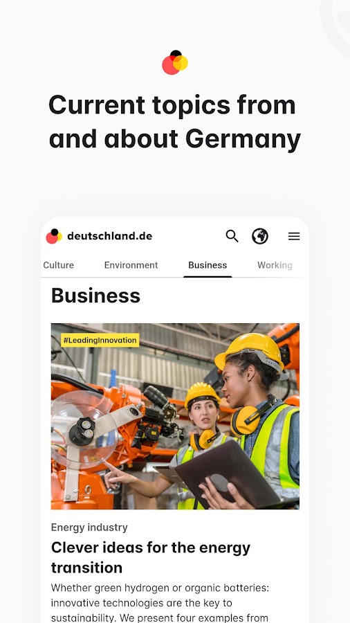 Погрузитесь в мир deutschland.de — вашего источника новостей и информации из Германии. Наше бесплатное приложение переносит Германию прямо на ваше мобильное устройство — от последних событий в политике, бизнесе, науке и культуре до советов по работе, учебе и путешествиям.