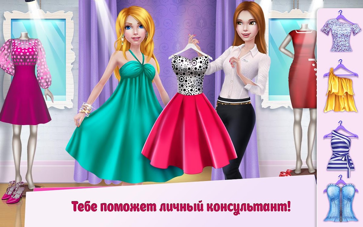 Шопинг до упаду! Ходи по магазинам в самом классном торговом центре города! Продемонстрируй всем свой стиль, красавица! Тебя ждет масса заданий – как в настоящем магазине! Одевайся в самые классные наряды и аксессуары, тебе на помощь придет личный помощник! Прими участие в модном конкурсе и голосуй за свой любимый образ! Пройдись по подиуму, как настоящая модель!