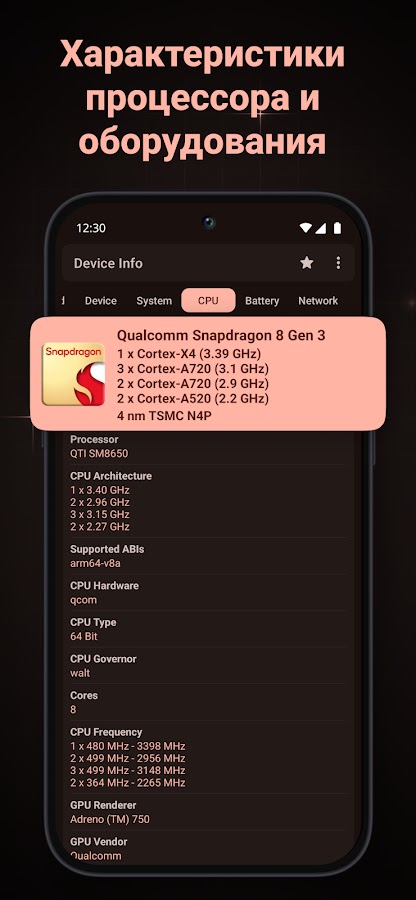 👉 ЦП: Soc — система на кристалле, процессоры, архитектура ЦП, поддерживаемые ABI, аппаратное обеспечение ЦП, регулятор ЦП, количество ядер, частота ЦП, рабочие ядра, средство рендеринга ГП, поставщик ГП и версия ГП