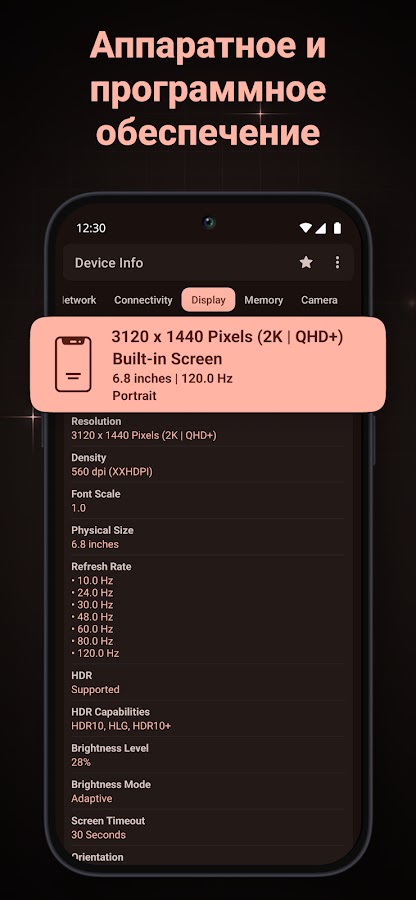 👉 Дисплей: разрешение, плотность, масштаб шрифта, физический размер, поддерживаемая частота обновления, HDR, возможности HDR, уровень и режим яркости, время ожидания экрана, ориентация