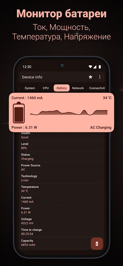 👉 Батарея: состояние, уровень, статус, источник питания, технология, температура, напряжение, мощность (Вт), ток (мА) и емкость
