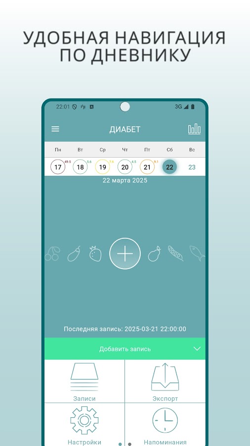 ДИАБЕТ® — дневник диабетика и приложение для самоконтроля при диабете 1 и 2 типа. Приложение помогает вести дневник глюкозы, питания, ХЕ, БЖУ, инсулина, лекарств, веса и артериального давления в одном месте.