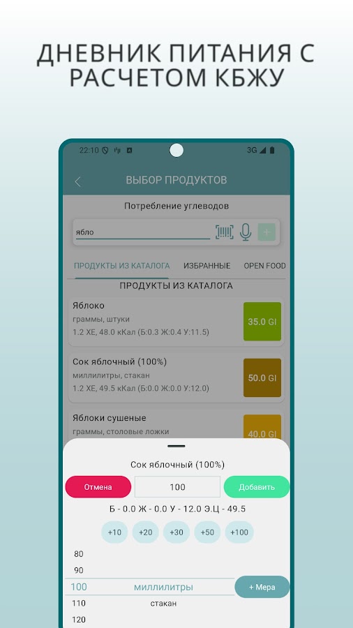 • Автоматический расчет ХЕ, БЖУ и расчет дозы инсулина на основе введенных пользователем данных и персональных настроек
