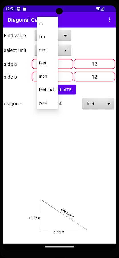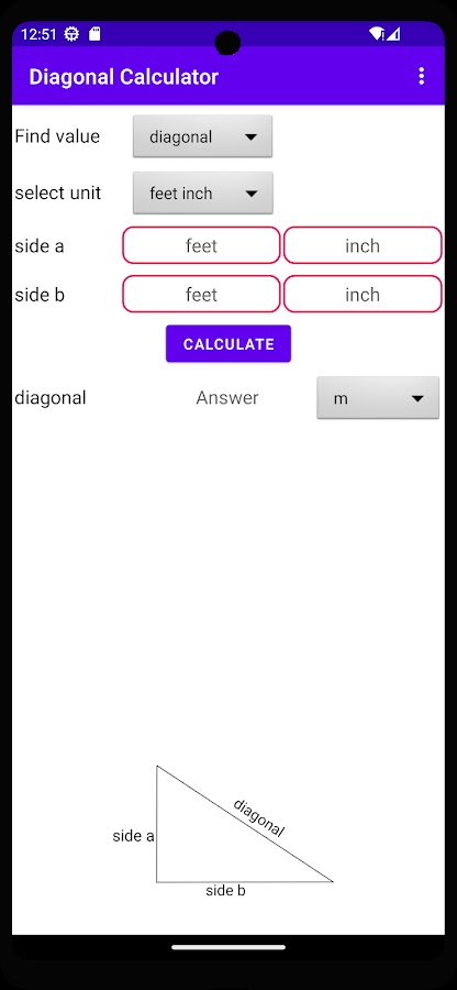 Диагональный расчет в основном используется в строительных работах для перекрестной проверки работ. Это приложение вычисляет диагональ с помощью теоремы Пифагора. В этом приложении вы можете вводить размеры в различных единицах измерения, таких как метр, фут-дюйм, ярд, мм и т. д.