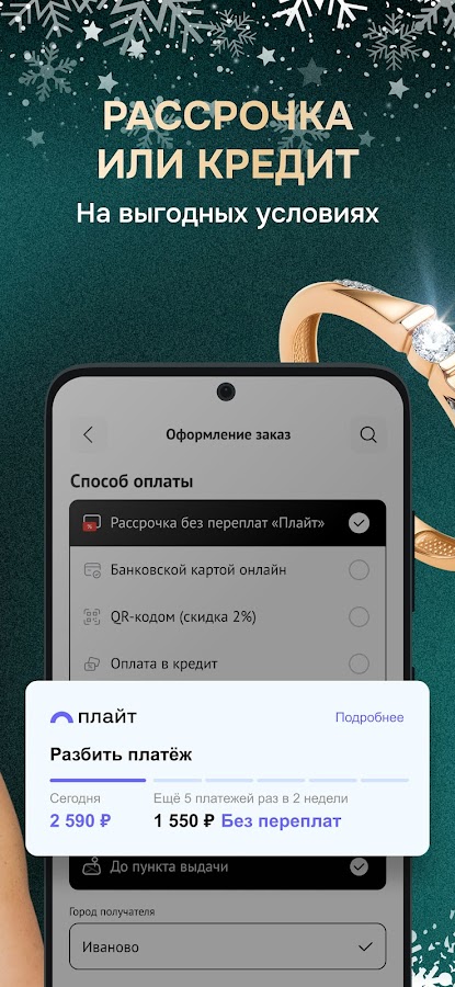 Помимо приложения у нас есть интернет-магазин, где можно в любой момент купить украшения с быстрой доставкой – для себя или в подарок. Хотите подобрать изделие с камнями? Или желаете купить обручальное кольцо? Заказать наручные часы? Всё это вы найдете в ассортименте ювелирного магазина Диамант.