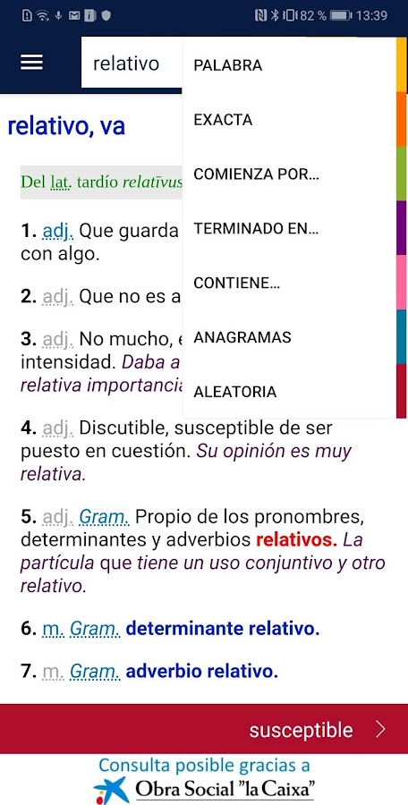 DLE — это официальное приложение, которое Королевская испанская академия (RAE) и Ассоциация академий испанского языка (ASALE) предоставили в ваше распоряжение для ознакомления с 23-м изданием «Словаря испанского языка». Этот бесплатный доступ возможен благодаря приверженности Obra Social «la Caixa» культуре.