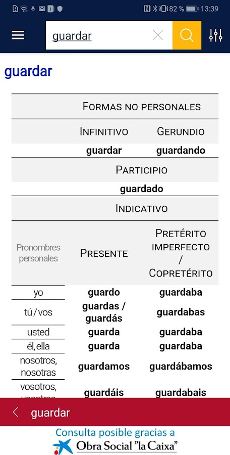 Мгновенно и легко решайте любые вопросы о значении слова, его орфографических и грамматических характеристиках, напрямую обращаясь к базе данных Королевской испанской академии.
