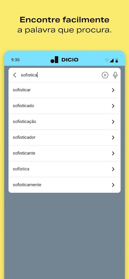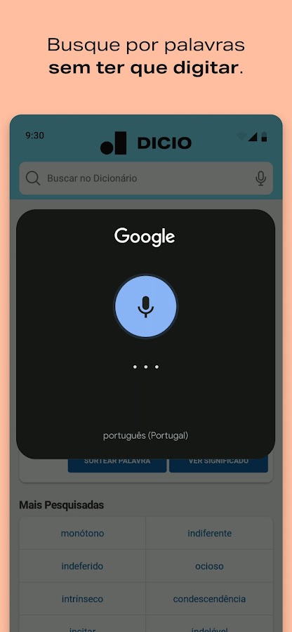 Самый большой и полный онлайн-словарь бразильского португальского языка теперь в виде приложения. В бесплатном приложении Dicio, вы можете просматривать всю информацию словаря, когда захотите и где бы вы ни находились. Этот португальский словарь с простым и привлекательным дизайном поможет вам найти значения, синонимы, антонимы и примеры использования многих слов на португальском языке.