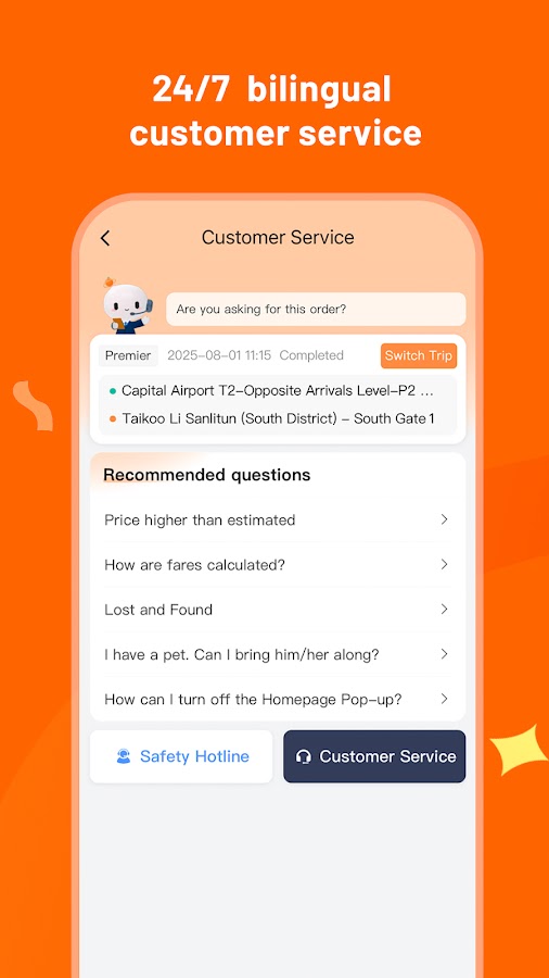 [Круглосуточная двуязычная служба поддержки] DiDi предоставляет круглосуточную онлайн-службу поддержки клиентов на английском языке в приложении.
