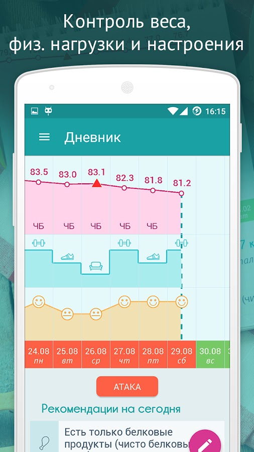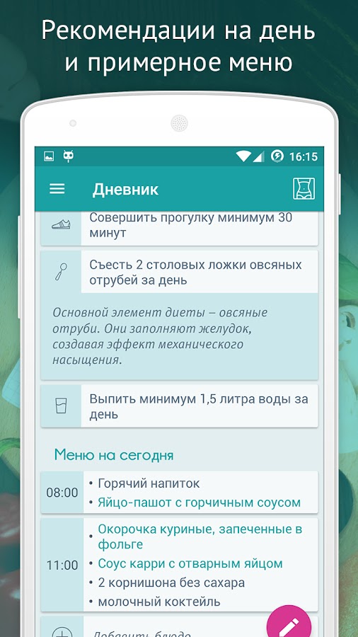 • Дневник диеты: контроль веса, физической нагрузки и настроения;