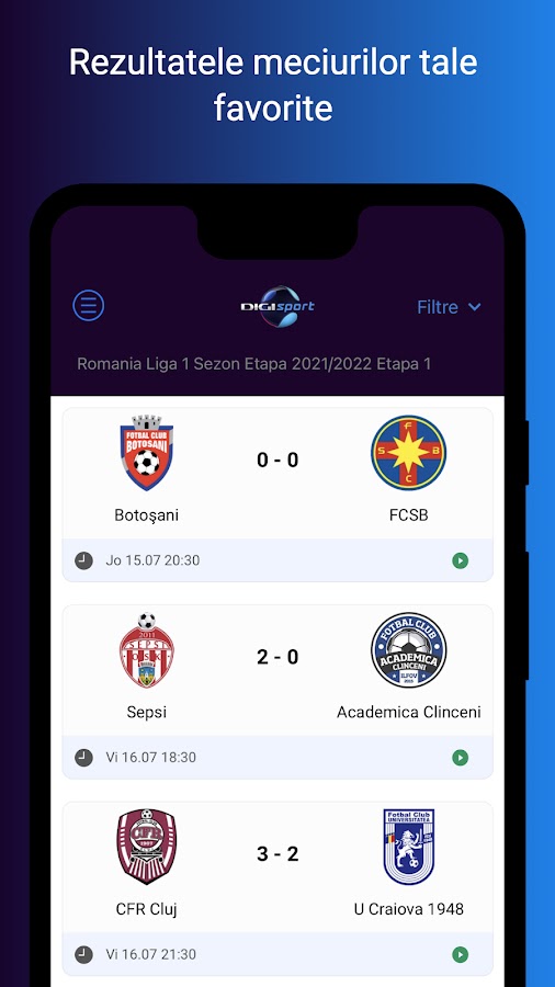 Приложение, которое поможет вам быстрее добраться до интересующего вас спорта и информации. В дополнение к самому богатому предложению новостей и прямых спортивных трансляций в Румынии, теперь у вас есть возможность получать личную информацию о начале матчей или шоу, которые вы хотите посмотреть.