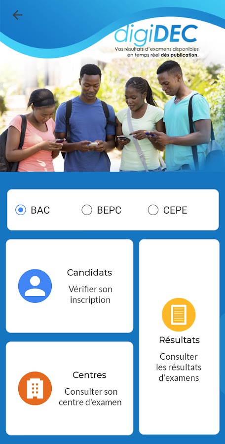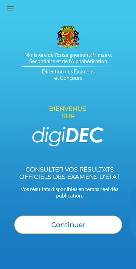 digiDEC — это приложение для ознакомления с результатами государственных экзаменов (BAC, BEPC и CEPE) Министерства начального, среднего образования и грамотности Республики Конго.