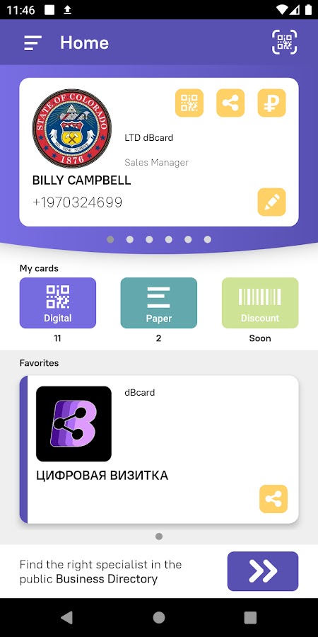 Цифровая визитка – электронная визитница в Вашем телефоне. Храните в смартфоне цифровые (электронные) и бумажные визитки, а также передавайте контакты с помощью ссылки или QR-кода.