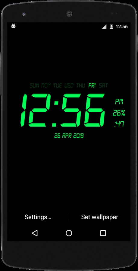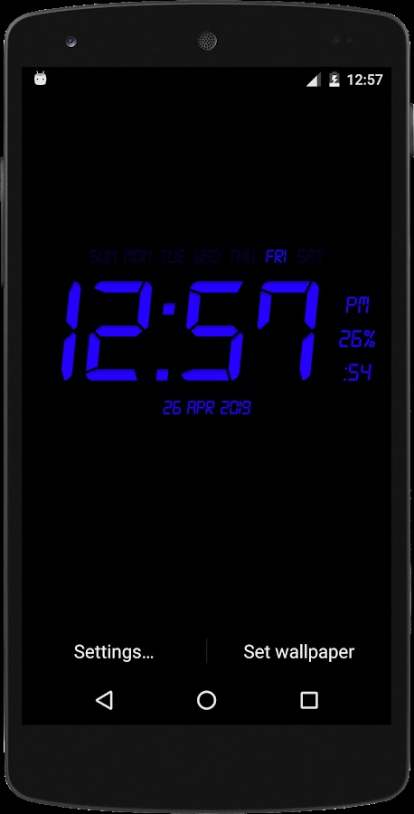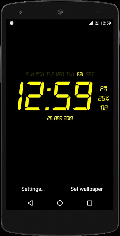 Живые обои, которые отображают текущее время, дату и процент заряда аккумулятора. Все форматы даты поддерживаются.