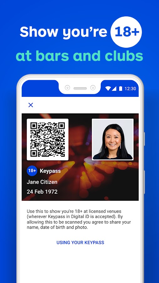Если вам 18 лет или больше, вы можете получить бесплатный Keypass в Digital iD™, который можно использовать для входа в лицензированные заведения или покупки алкоголя в некоторых штатах и территориях^.