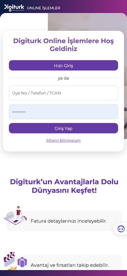 После установки приложения онлайн-транзакций, ваш номер счета, мобильный телефон, адрес электронной почты или Т. С. Ваш идентификационный номер и пароль, вы можете войти с Digiturk онлайн-транзакций.