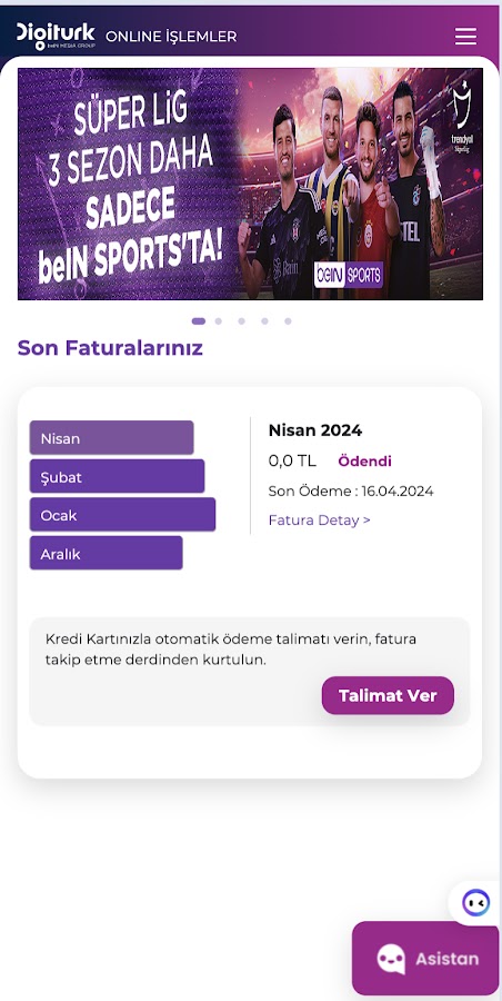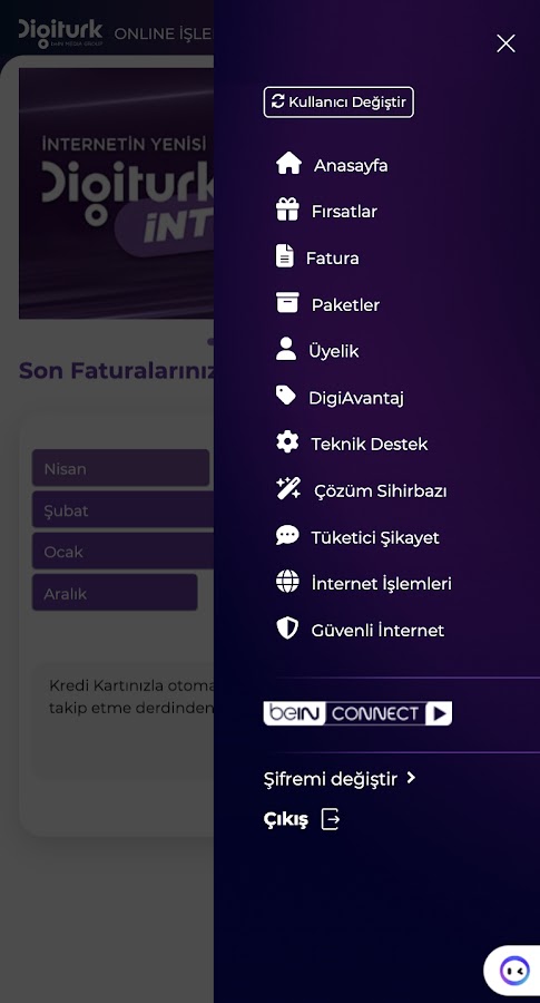 Вы можете запросить свои счета онлайн-транзакций, платить, вы можете дать автоматические платежные инструкции. Вы можете также добавить или уменьшить свой пакет подписки, вы можете купить фильм или игровую комнату, с возможностью удаленной записи вы можете сохранить ее для своих программ, которые вы хотите смотреть без Digiturk коробки дома.