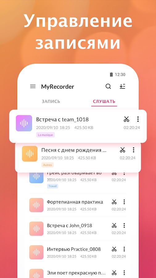 Вы можете записывать встречи и делать звуковые заметки в любое время, чтобы не потерять важную информацию на работе. Это полезный аудиорекордер, который вы также можете использовать в качестве аудиоменеджера для управления голосовыми заметками, аудиоплеера для воспроизведения на нескольких скоростях и инструмента звукового монтажа с помощью функции обрезки. Вы также можете категоризировать каждый звук, добавив теги.