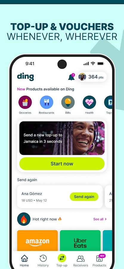 Скачайте приложение Ding для мгновенного и простого пополнения счета любого телефона. Где бы вы ни находились, вы можете пополнить свой счет или счет другого человека, а также получить доступ ко всем последним акционным предложениям и скидкам.