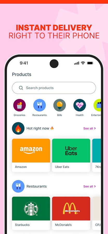 Приложение Ding можно использовать не только для пополнения счета. Если вы ищете простой и полезный подарок, чтобы улучшить кому-то настроение, вы также можете выбрать одну из множества наших электронных подарочных карт.