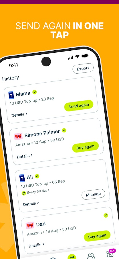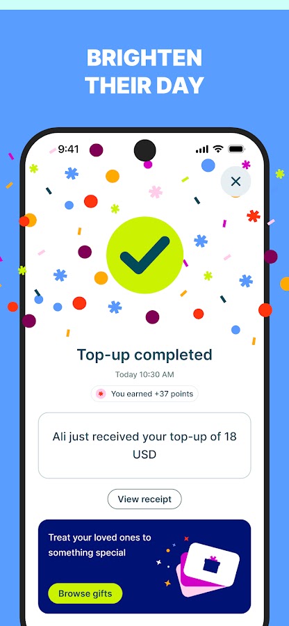 Им очень легко пользоваться. Просто выберите контакт, укажите сумму пополнения и оплатите. Вы можете использовать любую кредитную или дебетовую карту основных платежных систем, а также PayPal и Apple Pay. У нас нет скрытых или непонятных комиссий. Вы всегда будете знать, сколько вы тратите и сколько получит адресат.
