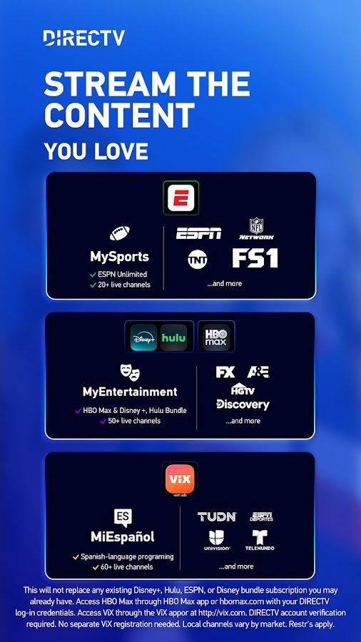 *Требуется совместимое устройство и подключение к интернету. Доступно только в США (за исключением Пуэрто-Рико и Виргинских островов США). Ограничено 3 одновременными потоками вне дома. Действуют ограничения на трансляцию. Местные каналы различаются в зависимости от региона. Для просмотра устройство может находиться в регионе выставления счетов. Местные каналы различаются в зависимости от региона. На спортивный контент распространяются ограничения. MyFree — бесплатный сервис. Платные услуги: 5-дневная бесплатная пробная версия, затем автоматическое ежемесячное продление. Отмена в любое время. Требуется кредитная карта; может быть применена временная блокировка средств на счете. Возраст — 18+. Требуется высокоскоростной интернет. Действуют ограничения. Подробности на сайте directv.com. Это не заменит существующие подписки на Disney+, Hulu, ESPN или пакеты Disney. Доступ к HBO Max осуществляется через приложение или ваши учетные данные DIRECTV. Доступ к ViX осуществляется через приложение ViX или на сайте vix.com. Требуется подтверждение учетной записи DIRECTV. Отдельная регистрация в ViX не требуется.