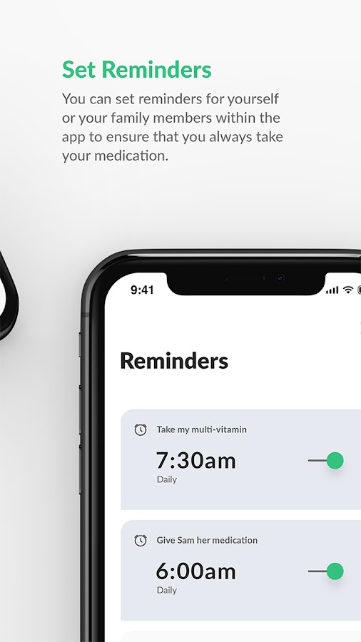 Вы можете установить напоминания для себя или членов вашей семьи в приложении, чтобы гарантировать, что вы (и члены вашей семьи) никогда не пропустите дозу вашего лекарства.