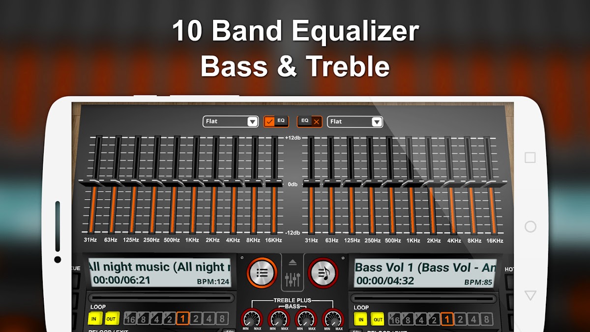 * Первое в мире виртуальное приложение для диджеев с 10-полосным эквалайзером — 10-полосный эквалайзер для Android 2.3+ под управлением диджейского слайдера с красивой анимацией. 10 полос обеспечивают более точный контроль с большей точностью. 17 встроенных предустановок эквалайзера — Classical, Club, Dance, Full Bass, Full Bass и Treble, Full Treble, Headphones, Large Hall, Live, Party, Pop, Reggae, Rock, Ska, Soft, Soft Rock & Techno
