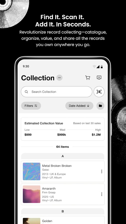 Официальное приложение Discogs — это лучший способ составить каталог вашей музыкальной коллекции, найти свой грааль, проверить цены и купить музыку в крупнейшей в мире дискографии физической музыки.