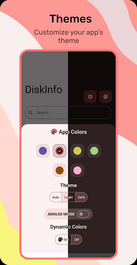 Приложение поставляется с 6 цветовыми темами, а также поддерживает динамические темы (доступно только в Android 12).