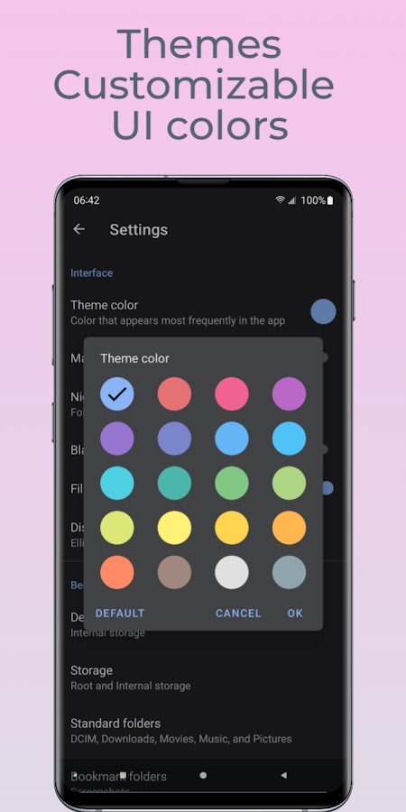 • Темы: настраиваемые цвета пользовательского интерфейса, а также ночной режим с опциональным настоящим черным цветом.