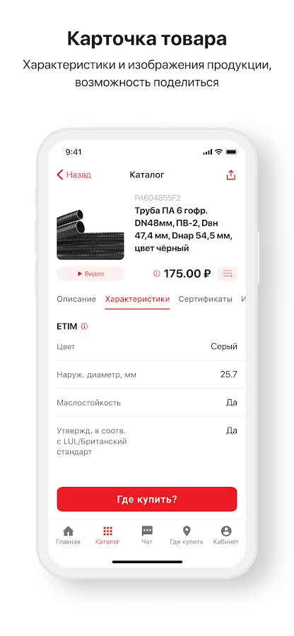 Каталог продукции. Фильтруйте, сортируйте, просматривайте детальную информацию о продукции: характеристики, сертификаты, чертежи, каталоги, цены. Выполняйте поиск продукции по штрихкоду, коду или названию. Делитесь ссылкой на товар с другими людьми.