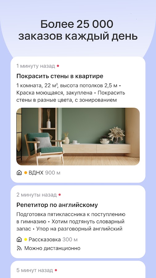 У нас — 900 специальностей. Есть работа для популярных специальностей — например электрик, репетитор, мастер по маникюру. Дело найдётся всем, есть работа и подработка для студентов. Можно выполнять заказы сразу по нескольким специальностям, брать удалённую работу или работу на дому.